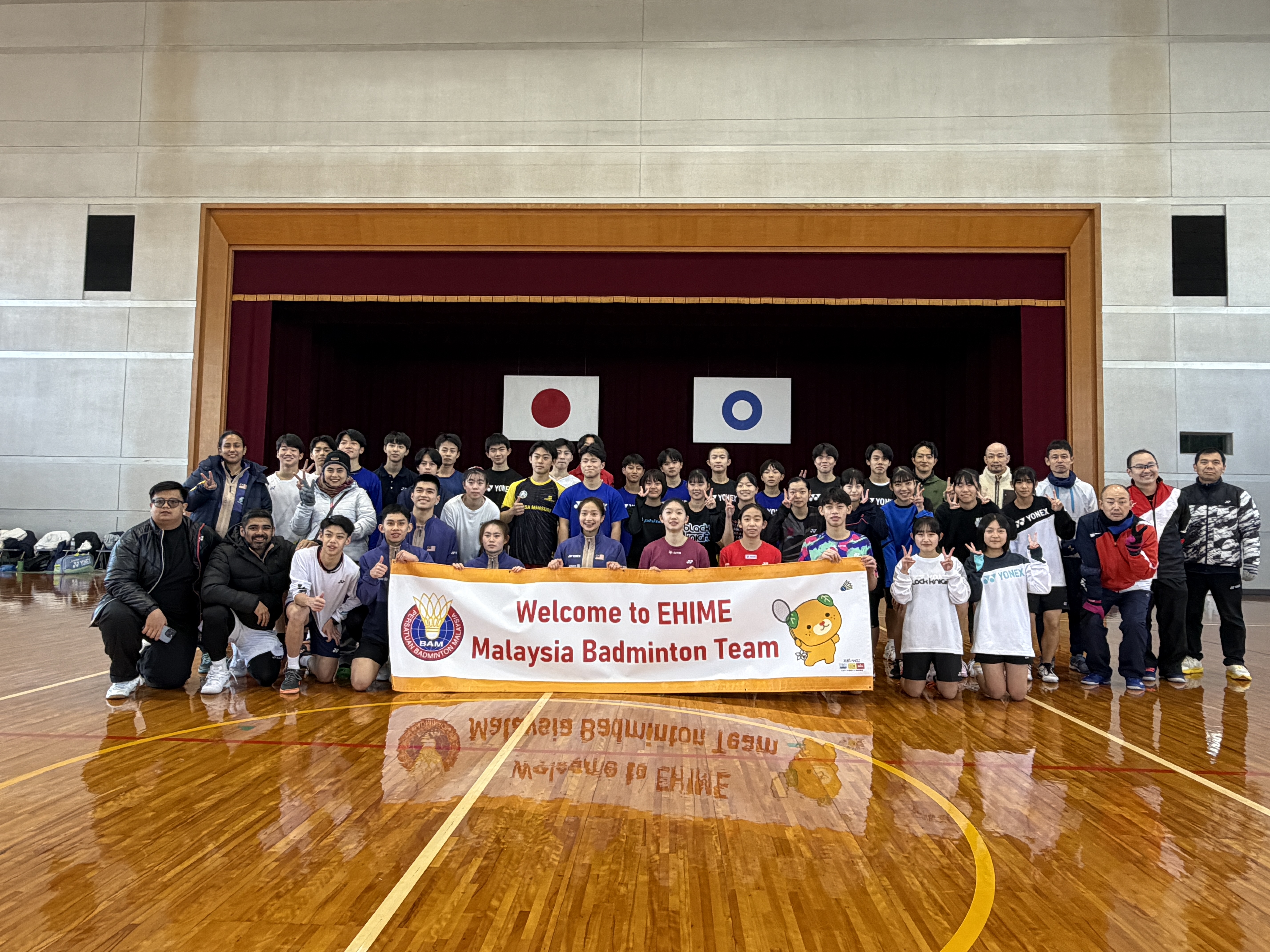 バドミントン部【マレーシア選手との交流事業に参加】 2025年12月18日 16時00分 12月16日(水)に大洲市総合運動公園体育館にて行われたマレーシアジュニア選手との交流事業に、本校からも男女2名ずつの計4名が参加してきました。 バドミントンでの交流はもちろん、バスでの移動や昼食、ぞうきん掛けレースなどともにし、とても刺激的な1日となりました。